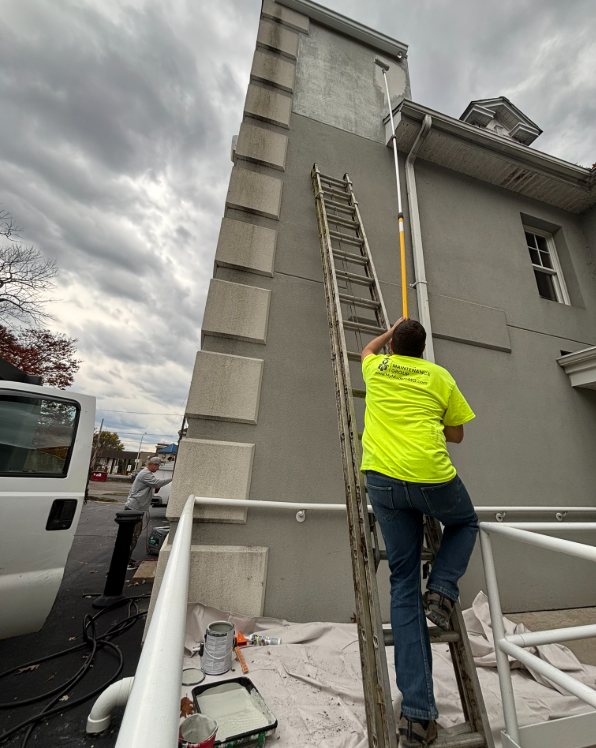 Our team replaced a section of exterior foam insulation and resurfaced it with Dryvit, seamlessly blending the new texture with the existing finish. We then precisely matched the paint to the building's current exterior color. This project was completed at the DLP law office building in Kingston, PA.