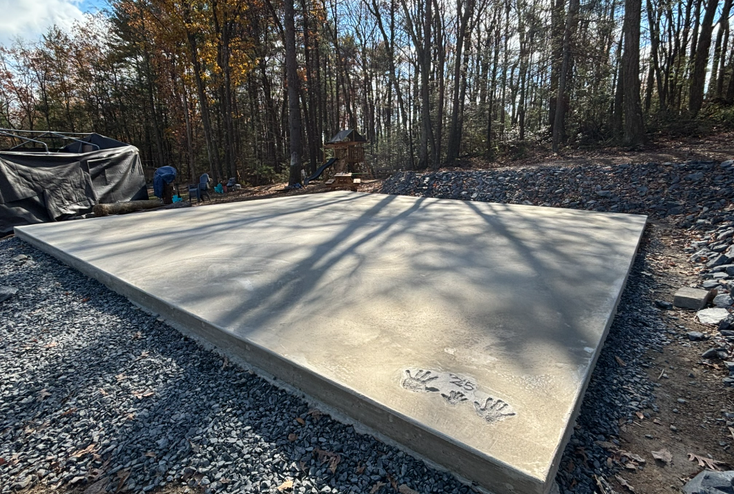 Professional installation of a reinforced concrete pad foundation for a new pole barn structure in Kunkletown, PA. Our team ensured proper grading, compaction, and finishing to provide a durable, level surface that meets all structural requirements. We also ran buried conduit for an electrical line from the house to the building.